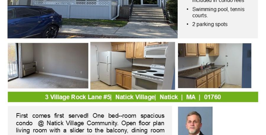 First comes first served! One bedroom spacious condo @ Natick Village Community. Open floor plan living room with a slider to the balcony, dining room opening to the kitchen. MBR with a full bath. Central air. Condo fees include water, swimming pool, tennis court, gym and clubhouse. EZ access to shopping, highways, and commuter rail. To qualify: first-time home buyer; Max annual gross income: family of: 1 person-$92,650; 2-105,850. Max liquid assets $75,000, pre-approved for a 30-year fixed mortgage. VA and FHA will not accept the deed rider. First step: send filled application and pre-approval. No other docs at this point!